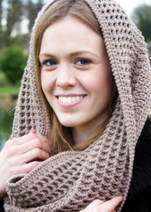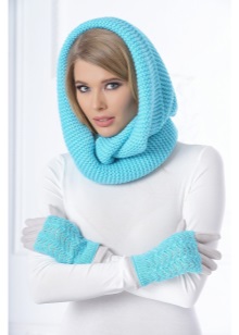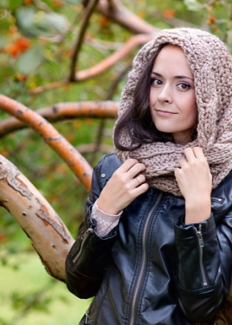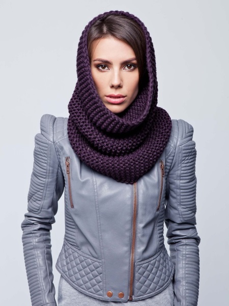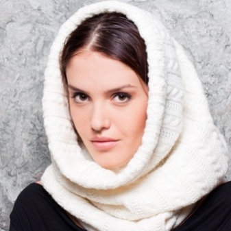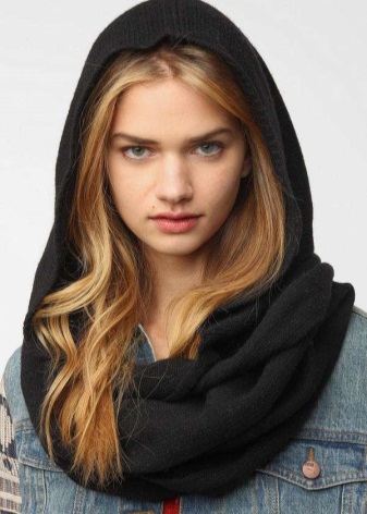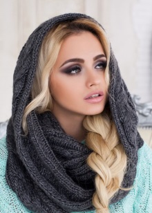 The hood is usually wound twice around the neck. One of the parts forms a hood. Such a scarf becomes a combined accessory that replaces two items: a headpiece and the scarf itself. Some versions with hoods are worn over the shoulders.