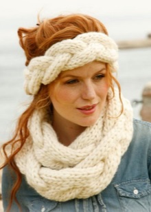 An interesting design of all sorts of proposed versions is a knitted scarf on the head. Today, the trend is knitted patterns with a large viscous and a variety of color combinations. It can be fantasy braids, English gum, jacquard patterns, cage, stripes. Often options are decorated with knitted elements, rhinestones, sequins, beads, depending on the purpose and style.