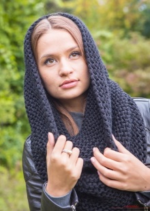 The model can be of different lengths and volumes. It all depends on the choice of image and features of the figure. This can be a kind of small scarf-shirt-front with a hood or a wide volume snood scarf.