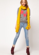 In combination with blue shades of clothing, a yellow scarf will create an incredibly stylish look: the contrast of bright colors will provide you with an abundance of attention and impression on others.