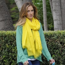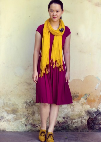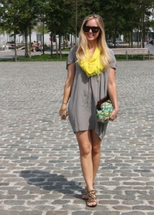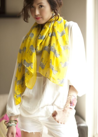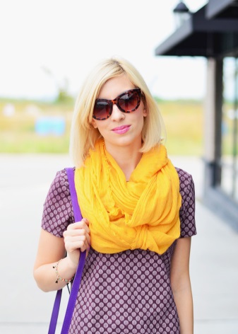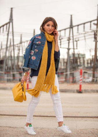 What can I wear a yellow scarf in the summer with? Sundresses and dresses of lilac, turquoise, white and beige colors are suitable for this, which will complement a light scarf. In a casual style, you can use a large knit scarf with a plaid shirt and a leather jacket, completing the look with dark jeans; This combination of a white tank and denim jacket will seamlessly integrate with a neat yellow scarf.