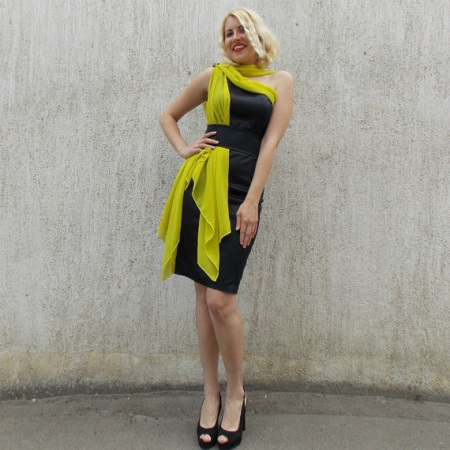 And, of course, one cannot help focusing his attention on the question “what to wear with?”. Among the bows with the participation of a yellow scarf, there are many variations. For an evening look, a black dress framed by an almost weightless, airy yellow scarf is suitable.