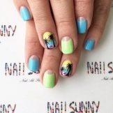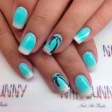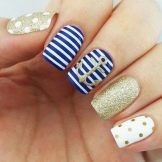- Nautical. Especially this manicure will be relevant in the summer, when you can support it with an ensemble of light sundress in an identical style. You can also make shellac with marine drawings when planning a vacation at sea. It can be geometric patterns in blue-white-red tones (stripes, waves), and beautiful shells, anchors or a beautiful “wind rose”.