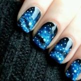 - Space. To create such a design will require a certain skill. Its primary color does not have to be solid. It is better to create a light effect of ombre or brightening (darkening) of certain areas. To achieve the result, you can purchase a special film (or sticker), on which both the background and the celestial bodies will already be depicted. If you are afraid to go too far with such a bright design, choose an accent manicure where the picture will be present on only one or two fingers.