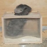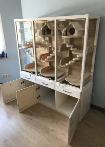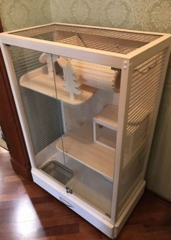 This type of dwelling for chinchillas is a wooden structure, several walls of which are made of metal mesh or glass. Compared with the first option, the showcase clearly wins in the issue of sound insulation - no animals are heard in it at all. Also, feed and filler do not fly outside the frame, as it is made of solid material.