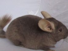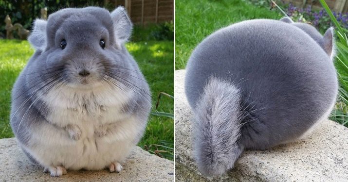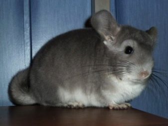 - Short-tailed (large). This breed has short forelegs along with powerful hind limbs. The tail is small. The neck is thick. The coat may be grayish-blue with a white belly. Such chinchillas are characterized by a wide head on which small ears of lilac color are located.