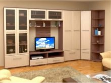 - Corner constructions are considered an ideal solution for a living room in a small apartment. This environment seems more compact and leaves more room for maneuver. Any additional modules are combined with a corner cabinet - a TV stand, a chest of drawers for linen and others.
