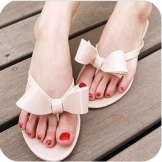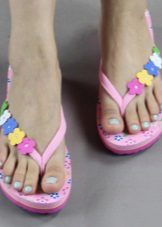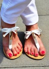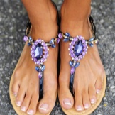 Hand-made fashion is in fashion, and needlewomen love to choose flip flops as a creative object. As a result of the experiments, ethno-style shoes appear wrapped in a bright satin scarf, as well as glamorous sparkling models with pearl-finish.