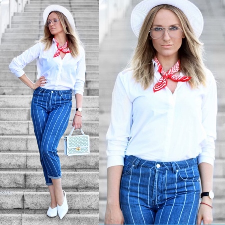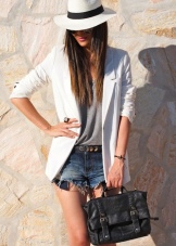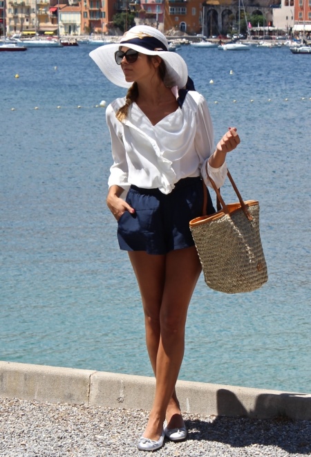 An ideal choice for creating a summer bow is a snow-white hat with wide sides, decorated with a ribbon. It can be worn in combination with a snow-white blouse and dark blue loose fit shorts. Silver ballet shoes and a capacious bag will complement the everyday look.