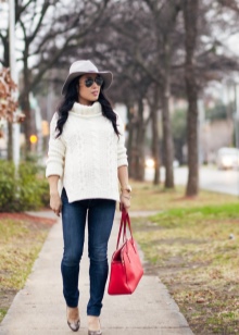 Knitted patterns are very popular. This hat can be worn in tandem with a sweater. It is worth giving preference to clothes of large knitting. Also, a snow-white hat is perfectly combined with both long and short dresses. It can also be worn with a short coat or jacket.