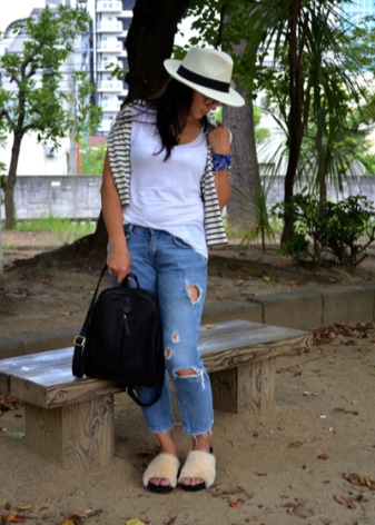 For every day, many girls prefer comfortable jeans and a T-shirt. And in this version, an exquisite hat of white color to complement the image, will bring a touch of elegance and mystery. An excellent ensemble is made up of pink tight-fitting jeans and a tank top to match the headdress. A cap with small margins and a decor in the form of a narrow black ribbon will be the highlight of a spectacular bow.
