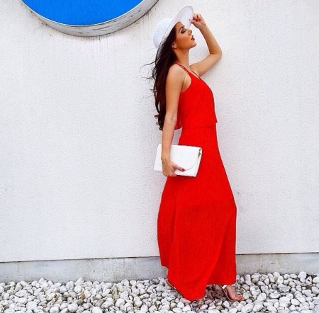 White color looks great with red. A combination of a red maxi dress, a snow-white hat with wide brim and a clutch bag matching the headdress will look bright and unforgettable.