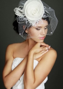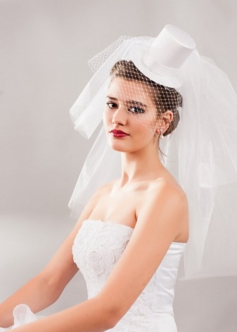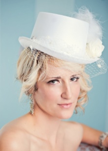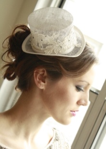 - Wedding look - many brides prefer to use this headpiece as part of their holiday look. Such hats can be decorated with a veil, feathers, a small veil, rhinestones, flowers and other ornaments, and can also be of the right size and be smaller than the size of the head to give the image additional lightness, fragility and femininity.