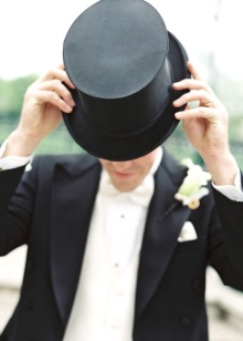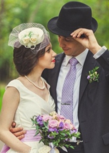 If the bride decided to wear such an original headdress, then the groom can try on it. The bride in a white top hat, the groom in black - this is a wonderful alliance for a wedding celebration.