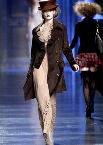 - Vintage image - like steampunk or the English era of the XIX century. This image can be created using a dark velvet coat with large buttons and dresses or blouses of a light shade with a frill collar. In addition to a blouse, strict high-waist trousers or a black pencil skirt can become. Despite its extravagance, such an outfit can be used in everyday life.