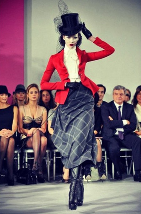 The second, bolder and brighter look, consists of a short, highly fitted red jacket, a loose long (but not half-floor) skirt of a dark shade or a large cage, a white blouse with a strict collar and boots or ankle boots with high heels or stilettos. This feminine and fatal image can be complemented by beautiful short gloves in black.