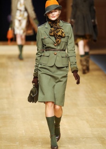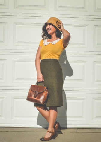 You can complement the stylish look with the help of retro-style clutches or classic handbags. Simple square-shaped clutches with shiny fittings, a miniature handle and a long shoulder strap will look great. You can wear a miniature watch or gold jewelry on your hand.Knitted scarves, stoles and neckerchiefs will allow you to create a feminine and attractive image.