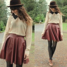 - A set of a red or burgundy skirt below the knee, a neutral gray blouse and a wide-brimmed hat in the color of the skirt will look very bright and saturated on the lady. With such a tandem, feminine high-heeled ankle boots will ideally look. You can complement the image with a miniature handbag on a chain strap, a light belt at the waist and a narrow bracelet.