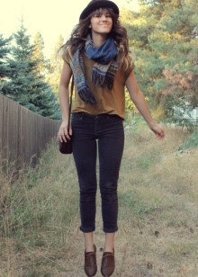 - A long light skirt made of fine textile, a plain blouse and a caramel leather jacket look easy and feminine. Such an ensemble is perfectly complemented by a small hat of beige or light brown color, Cossack boots and a loose scarf of neutral colors.