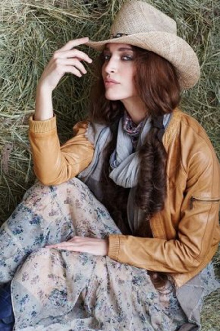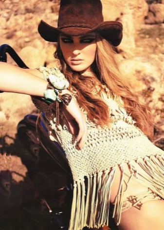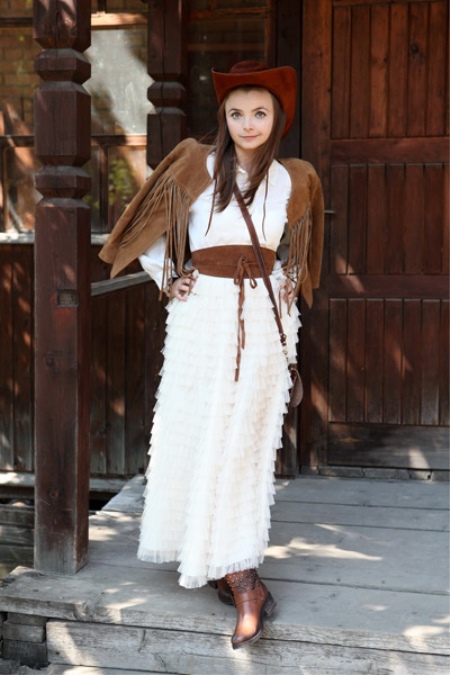 - An airy and delicate look will create a straight floor dress, complemented by a loose velvet fringed jacket. This ensemble will look perfect with a mahogany felt hat, a wide belt in color, a small bag over the shoulder and long-toed boots with a steady heel. Such a kit carries the true spirit of the Wild West, which will surely attract the attention of others on the street.