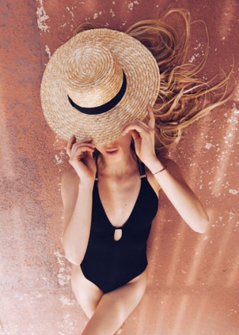 Straw models are often accessed when traveling at sea. They are in harmony with many bathing suits. Such light and laid-back ensembles will not only look feminine, but also protect their owner from scorching sunlight.