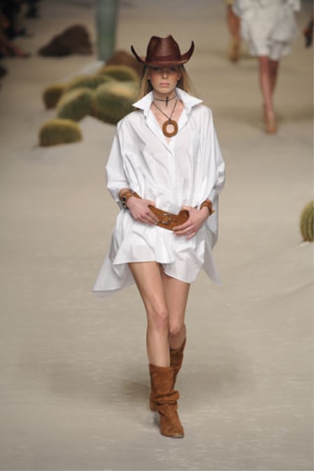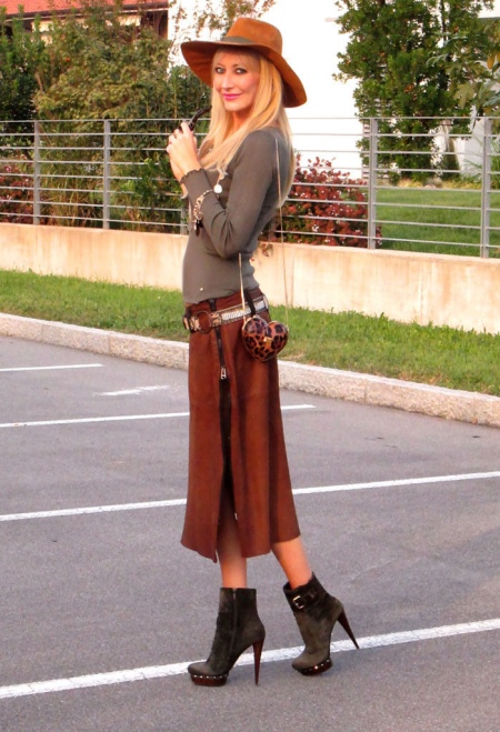 - You can emphasize beautiful and slender legs with the help of an elongated light shirt with a wide brown belt. A dark brown cowboy hat and mid-length suede boots will suit this spacious outfit. You can complement the bold image with a large pendant in the color of a hat.