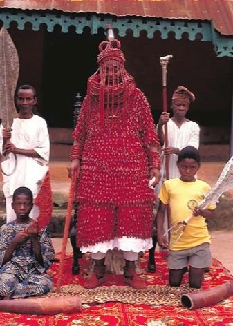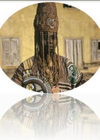 The traditional headdress of the leaders of the tribes of Nigeria is a huge crown, decorated with beads. It is decorated with figures of animals, birds and people made of beads. The thick veil covering the leader’s face is also created from several thin bead pendants.