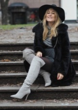 A delightful and feminine image, where a wide-brimmed hat favorably emphasizes the facial features of the model. The dress in pastel colors in combination with black looks very stylish, and in an ensemble with suede over the knee boots, luxuriously emphasizes the fragility and grace of a female figure.