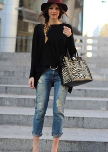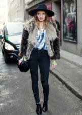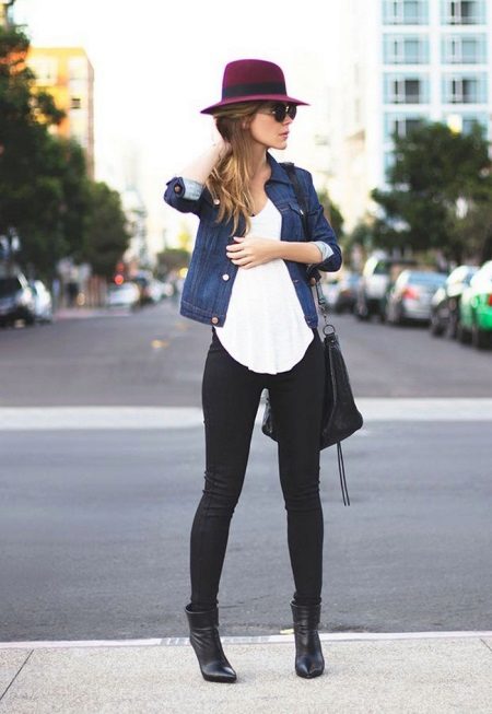 A practical and stylish urban-style bow - denim, white blouse, black skinny pants - a great combination for a practical and fashionable girl. Short boots with low heels add mobility and the ability to move around the city without any problems on foot, and Fedor's stylish hat successfully completes this fashionable bow.