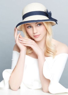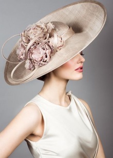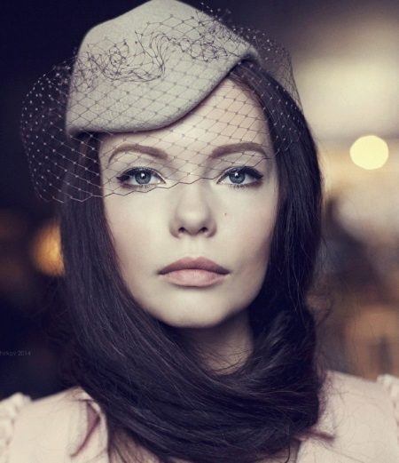 Her elegant and seasoned style emphasizes the neat features of the correct face shape. This is achieved due to the laconic style - tight-fitting tulle and narrow fields slightly tucked up over the entire diameter of the hat do not allow shadows to fall on the face and its width does not hide the beauty of a woman.