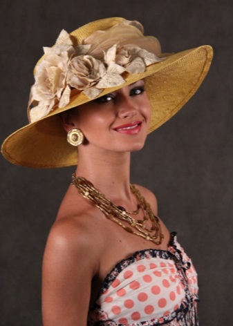 As a rule, the hat has a rather rigid tulle and soft margins, which can both rise and fall. Often the hat is decorated with a satin ribbon along the bottom edge of the tulle.