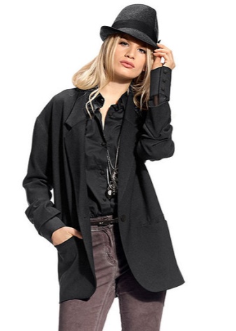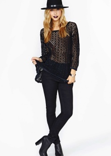 You can wear models with skinny jeans and loose-fitting shirts with a pattern. To blue denim you can pick up a black hat with an average field width, a knitted tunic in a monochrome strip. Round off this look with light sneakers.