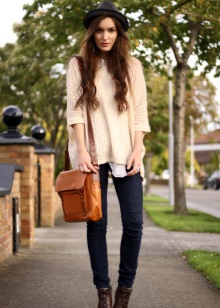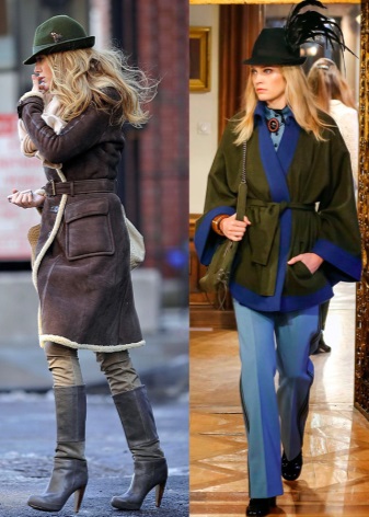Perfectly Tyrolean hat is combined with a plaid shirt, women's chinos and brogues. You can complement the image with a bag-bag and a watch. A Tyrolean hat is suitable for a coat of dark tones and high-heeled boots.