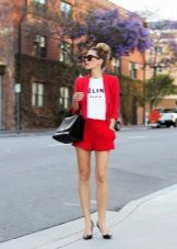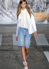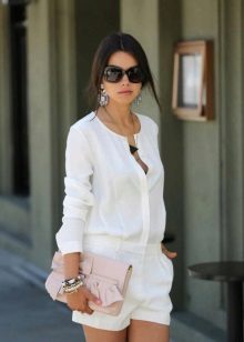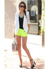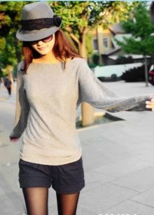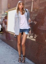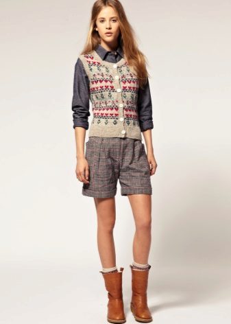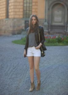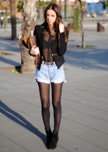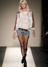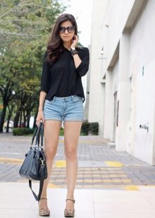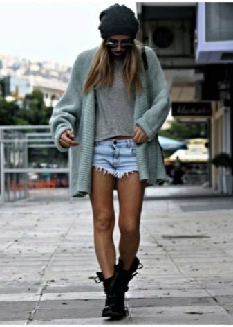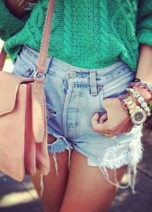 - In autumn, shorts, especially jeans, look very stylish with leather jackets and jackets, fur vests. In the cool days of spring and summer, windbreakers and sweatshirts, sweaters, cardigans are suitable.A peculiar charm is achieved by a tight-fitting cut of shorts and a free style of clothing on top. You should know that layering is in fashion, therefore, under a loose sweater falling from one shoulder, you can wear a top with narrow straps, and a jacket over a T-shirt or shirt.