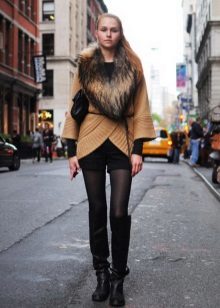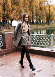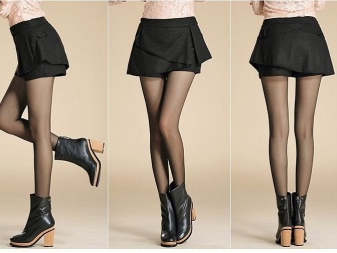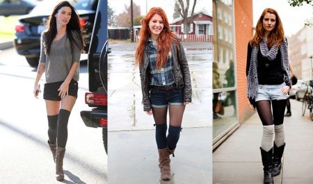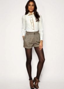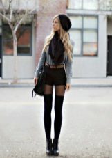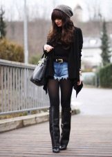 - Winter is not a reason to refuse shorts that stand out favorably. In order not to freeze, it is enough to put on tights under the shorts, and not only thin kapron, but also warm ones will suit, many of which add a mood of coziness and softness to the bow. In addition, you should choose long outerwear, whether it be a coat or parkas, to additionally warm up. And finally, short shorts allow you to wear long boots and boots.