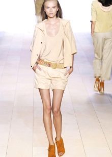 So, jeans shorts are universal, and warmed knitted, woolen, tweed - winter options. In summer, you can find shorts made of cotton or linen, and their style is more likely to be loose, and beach ones can be transparent at all.