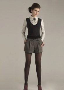 The business image consists of shorts and tights, a shirt and a jacket tucked under them, high boots and a bag. Everything should be done in a solid palette, for example, black and dark gray.