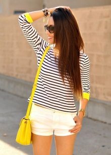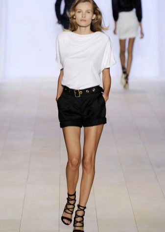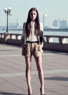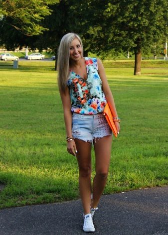 With shorts they put on shirts, tops, tunics, blouses, sweaters, shirts, bodysuits, and on the beach there is even just a bodice from a swimsuit. High-waisted shorts are worn both with tops, so that a thin strip of belly skin remains open, and with clothes that are tucked under the belt. You can fill shirts or shirts with a low rise.