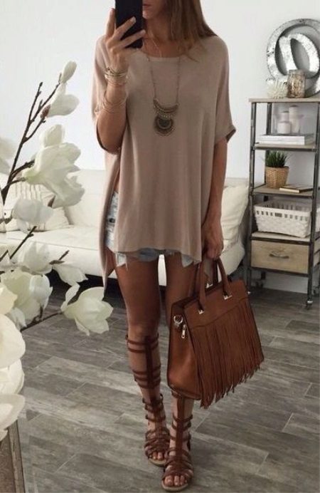 The intrigue will be created by an elongated beige tunic worn over blue short shorts with cutouts on the sides. High sandals, a brown fringed bag, and ethnic-style accessories complete the look.