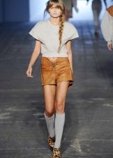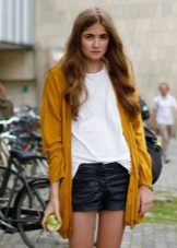 Leather shorts are in perfect harmony with knitwear. For the realization of everyday onions, they can be combined with soft sweaters or warm cardigans. Short tops are preferred by young girls. With a long cardigan, you can create a feminine bow. A great addition to a short cardigan or asymmetric sweater will be a plain t-shirt underneath.