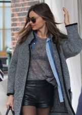 Many girls love the combination of black leather loose fit shorts and high tone over the knee boots. This tandem looks stylish and spectacular. The perfect complement is a soft, warm white sweater and a gray coat on top. A black clutch bag on a chain will be the final element of an attractive look.