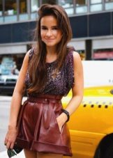 High-waisted shorts look spectacular and bright, complemented by decor in the form of spikes, buckles and rivets. They can be worn with a white T-shirt tucked underneath. A remarkable addition to an irresistible bow will be a black clutch bag and discreet jewelry. Leather shorts emphasize a thin waistline, giving an image of elegance and grace.
