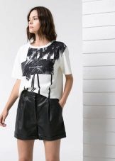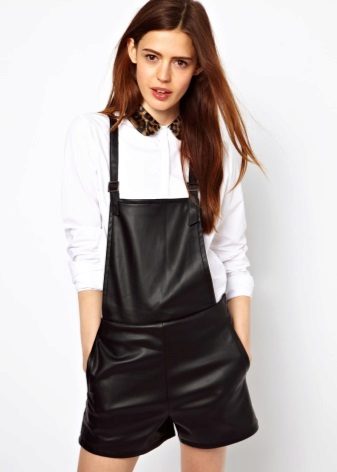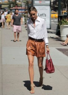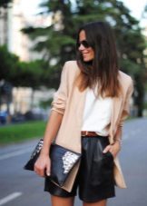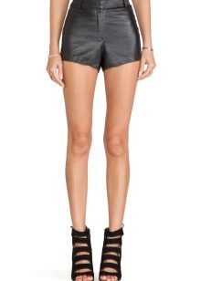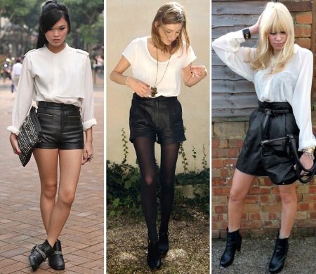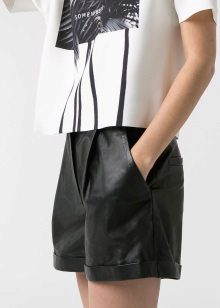 The trend is black leather shorts in an ensemble with a white shirt, male cut. Many fashionistas prefer a denim shirt. Such a tandem looks spectacular if you tuck your shirt in shorts, roll up your sleeves and fasten all the buttons.