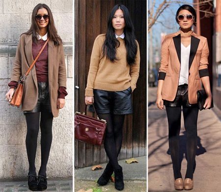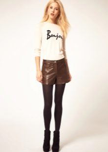 Leather shorts look great in combination with dense nylon tights for the cold season. They can also be worn with beige or smoky nylon tights.