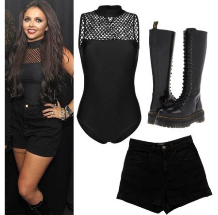 The rocker outfit, which consists of black leather shorts and a black jacket-overcoat over a regular white t-shirt, looks beautiful and fashionable. When choosing shoes, you can give preference to comfortable sneakers. A great complement to the image will be a capacious leather jacket in tone with a jacket and dark glasses.