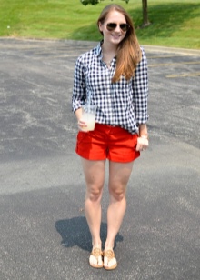 Often, designers use cotton when sewing shorts. Checked shorts look spectacular and beautiful. They can be used to embody the office look, if the dress code allows. Red check shorts should be combined with a plain shirt decorated with checkered inserts. This image looks harmonious and stylish.