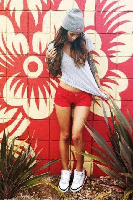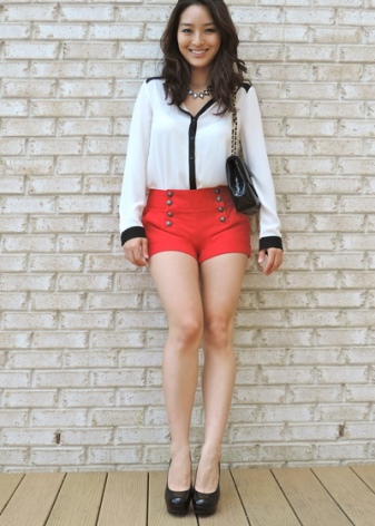 Slender girls fit any style of red shorts. Owners of magnificent forms should be careful with the choice of model. So, if you want to hide your stomach, you should give preference to models with a high waist and a bright belt.