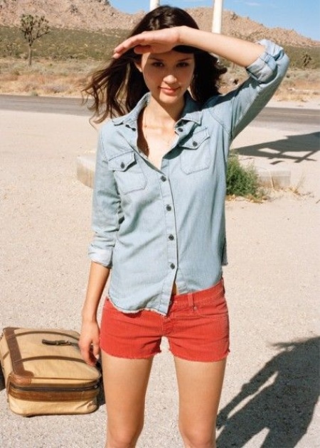 Denim is very popular in the new season. Red denim shorts will be the highlight of an unrivaled look. Girls with a perfect figure often replenish their wardrobe with mini models with low waist.