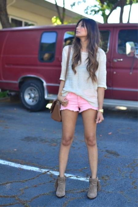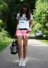 Pink shorts are a great choice to complete the look. This color refers to a calm color scheme. Pink clothes are often preferred by balanced girls who seek to create a soft and attractive image.