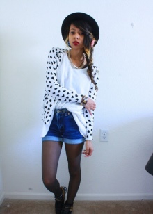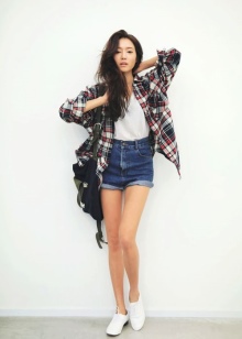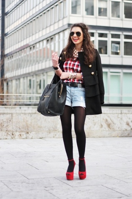 Shorts are clothes not only for summer, but also for warm spring and autumn. Therefore, tights are a necessary element. Shorts with tights - not a bad manners. Combine shorts with a red checkered top and red shoes to bright and sexy look. Glasses, a handbag and voluminous jewelry will effectively complete the bow.